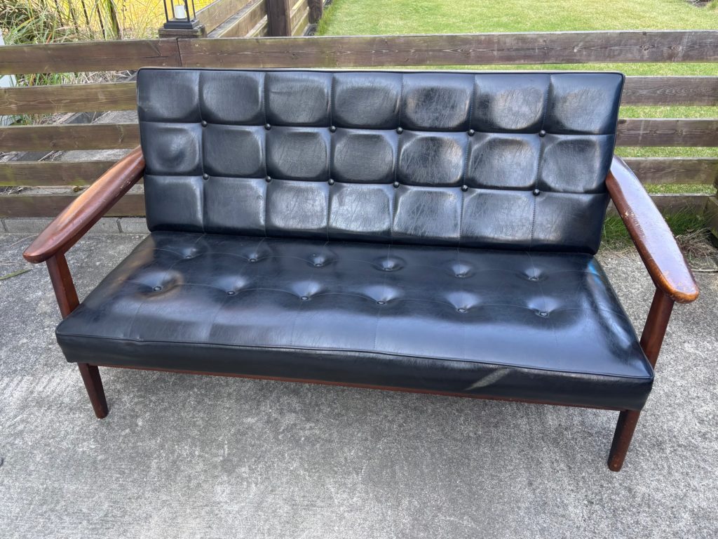 今回拝見したソファは、チーク系の木肘フレームに黒レザーの座面を合わせた、1960〜70年代頃のオールドカリモク製。